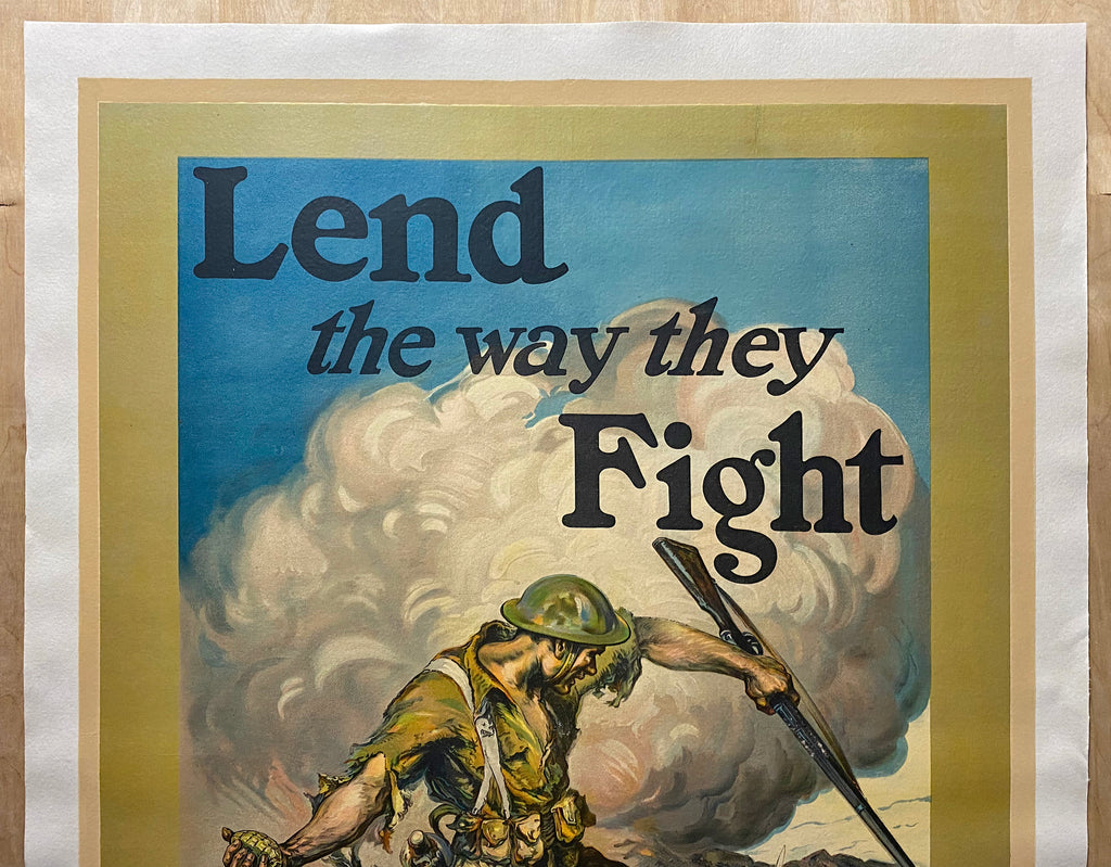 This vintage original 1918 poster was created by the artist Edmund M. Ashe and issued by the United States Treasury to help promote the sale of war bonds during the First World War. For this poster Ashe renders a harrowing image of a U.S. Army doughboy in tattered shirt reeling back to hurl a hand grenade. German soldiers with bayonets fixed occupy a trench position just in front amidst a no-man’s-land hellscape of billowing smoke and burnt earth. Text brackets the visceral combat scene and implores the viewer Lend the way they Fight – Buy Bonds to your UTMOST.