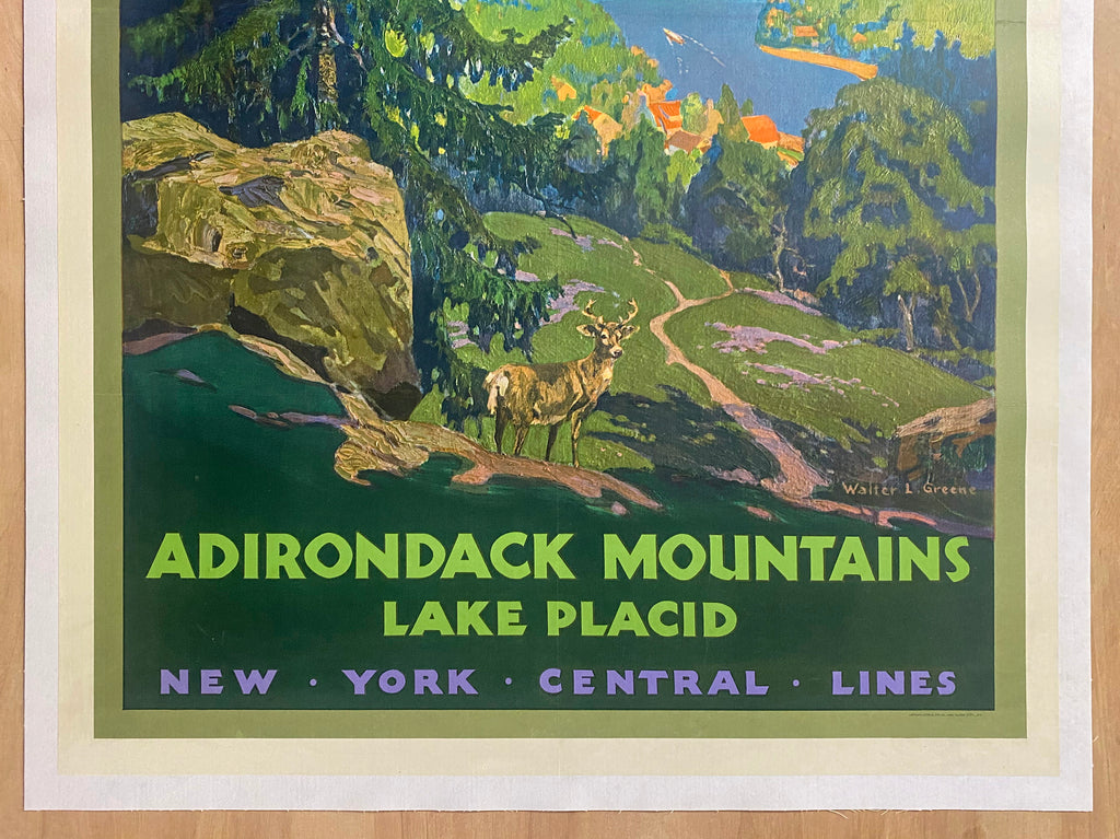 This beautiful vintage original poster featuring the Adirondack Mountains and Lake Placid region of New York State was created by the artist Walter L. Greene (1870-1956) for the New York Central Railroad and issued around 1930. For this poster Greene renders an image of the magnificent scenery of the Adirondak region including a mountain lake, rugged highlands and a large stag standing sentinel over it all in the foreground. Walter L. Greene was the Art Director for General Electric between 1903 and 1940 and also provided artwork for the New York Central Railroad beginning in the mid 1920s. The lower right margin indicates this poster was printed by Latham Litho. & Ptg Co. of Long Island City, New York.