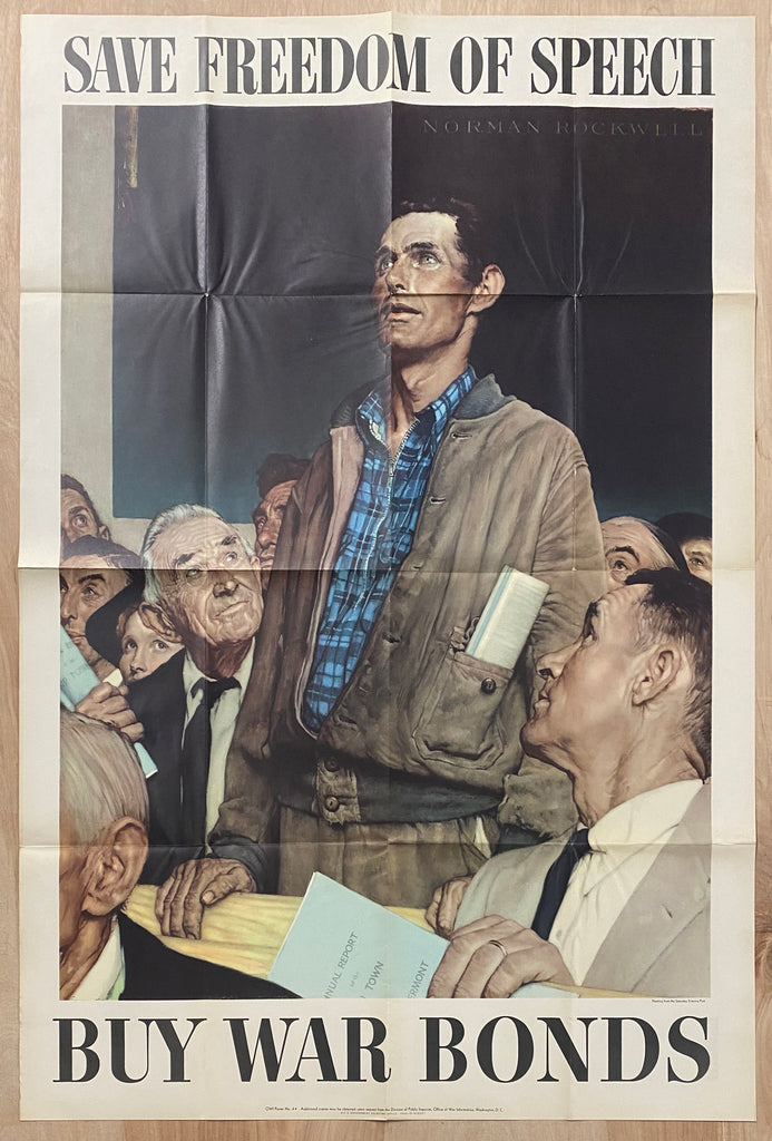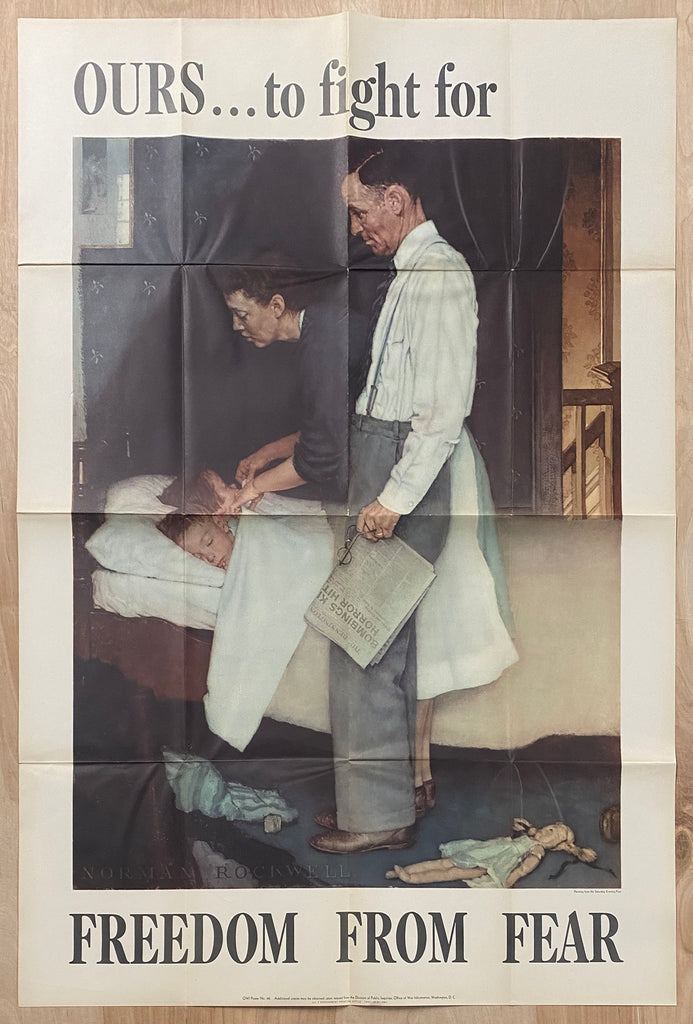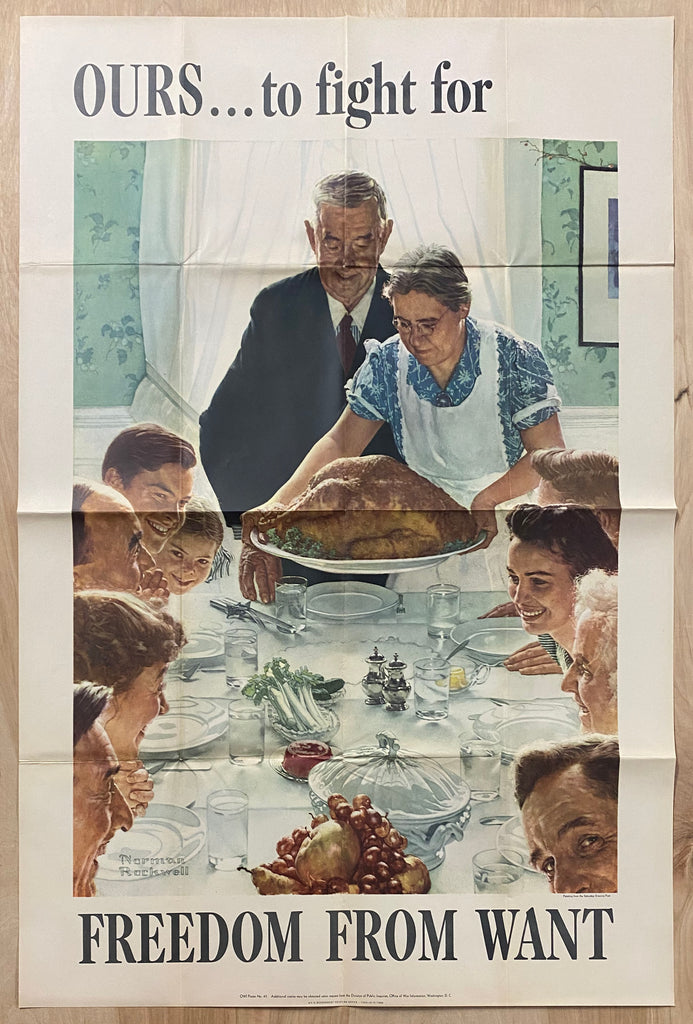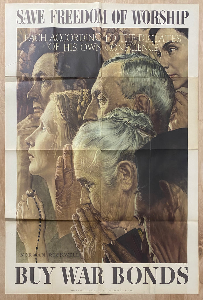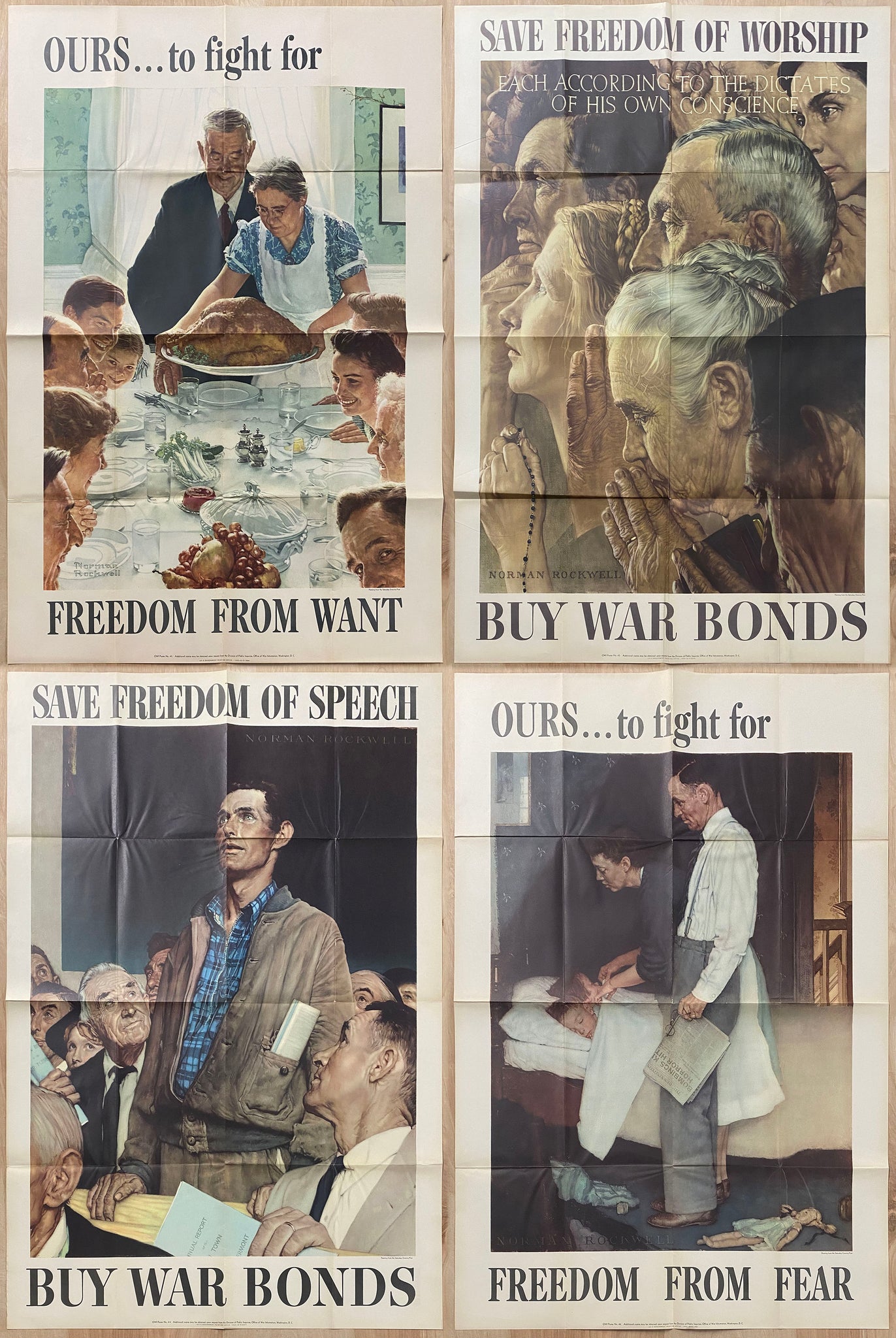 This is the complete set of all four vintage original WWII era posters comprising Norman Rockwell’s Four Freedoms series. All posters in this set are the full one sheet size measuring 40” x 28.5. The set includes Freedom Of Worship (OWI Poster No. 43), Freedom Of Speech (OWI Poster No. 44), Freedom From Want (OWI Poster No. 45) and Freedom From Fear (OWI Poster No. 46).
