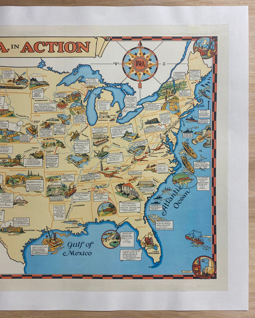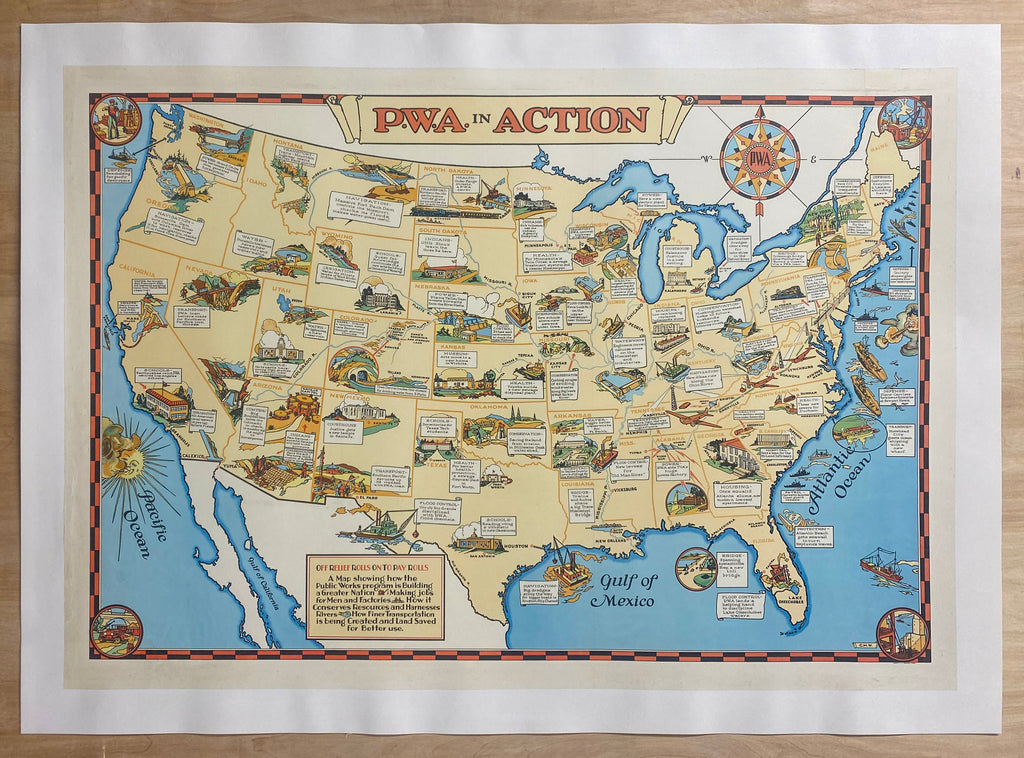 1935 P.W.A. IN ACTION United States Pictorial Map PWA WPA New Deal Public Works