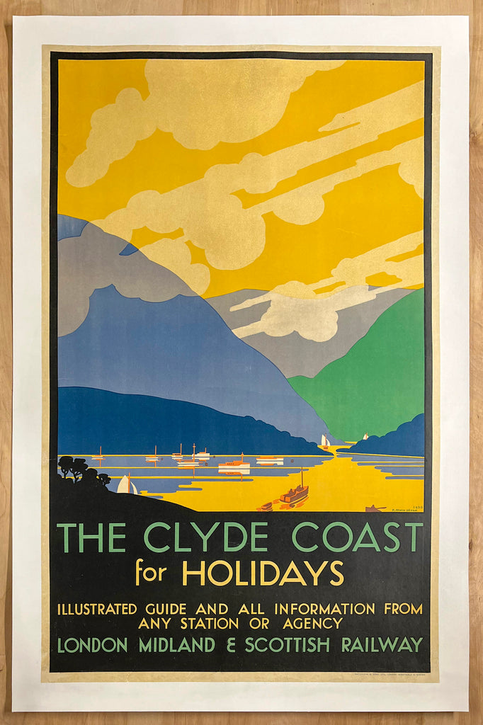 This is a vintage original poster promoting the Clyde Coast of Scotland was created by the artist Pieter Irwin Brown in 1930 for the London, Midland & Scottish Railway.  The Firth of Clyde, sometimes referred to as the Clyde Waters of Clyde Sea, is the estuary of the River Clyde, on the west coast of Scotland. This beautiful part of the world is known for the rugged landscape and some of the deepest coastal waters of the British Isles.  For this poster Brown renders a westerly view of a tawny sky at sunset illuminating passing clouds and distant craggy highlands with boats at rest on the placid waters below.   Text below the image reads: