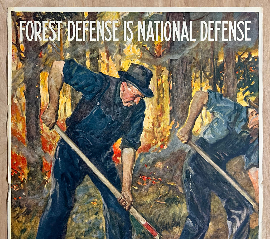 This vintage original and rare WWII poster was created by the artist James Montgomery Flagg and issued by the United States Department of Agriculture Forest Service in 1941. For this poster Flagg renders an image of two men in denim overalls working with shovels to battle a forest fire seen in the background under the title FOREST DEFENSE IS NATIONAL DEFENSE. This poster is one of at least three that Flagg designed for the United States Forest Service during WWII and seems to be the rarest of the group. The lower margin has the United States Forest Service logo and lists tips for preventing forest fires. The lower margin also indicates this artwork originally appeared in The American Weekly newspaper supplement on April 16, 1941.