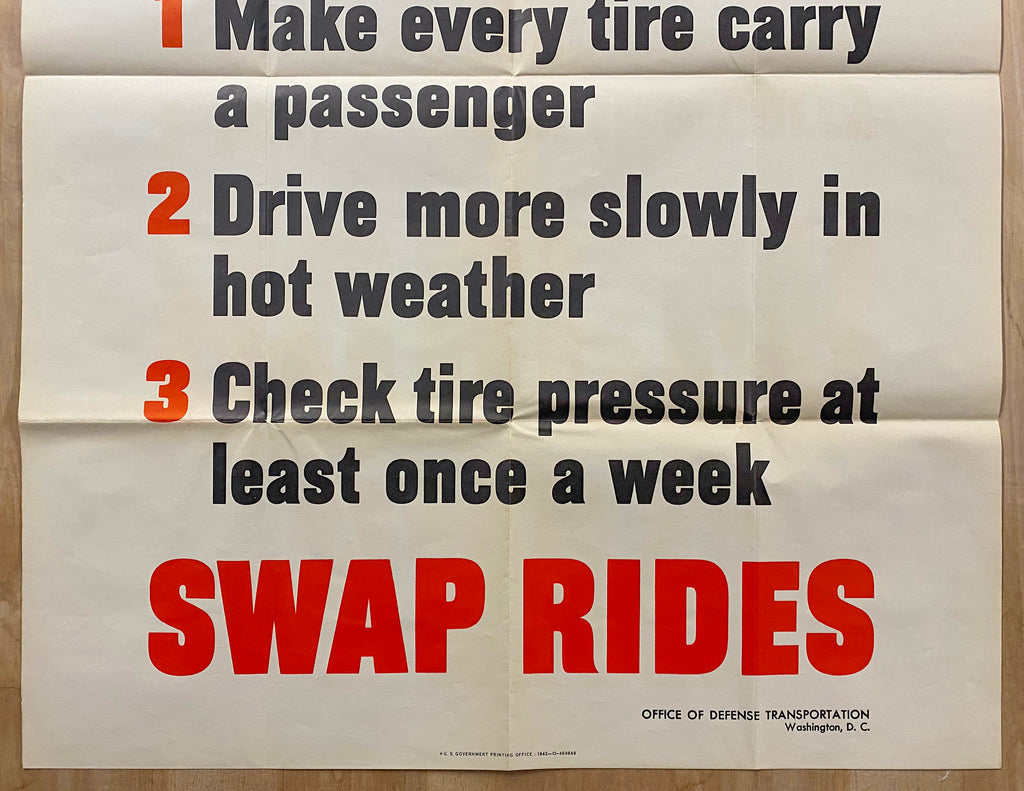 This vintage original poster was issued by the United States Office of Defense Transportation in 1942 to encourage Americans to carpool and rideshare to help preserve rubber supplies for the war effort. This is a text only poster with large red block capital letters reading SAVE RUBBER – SWAP RIDES bracketing bullet points that read: