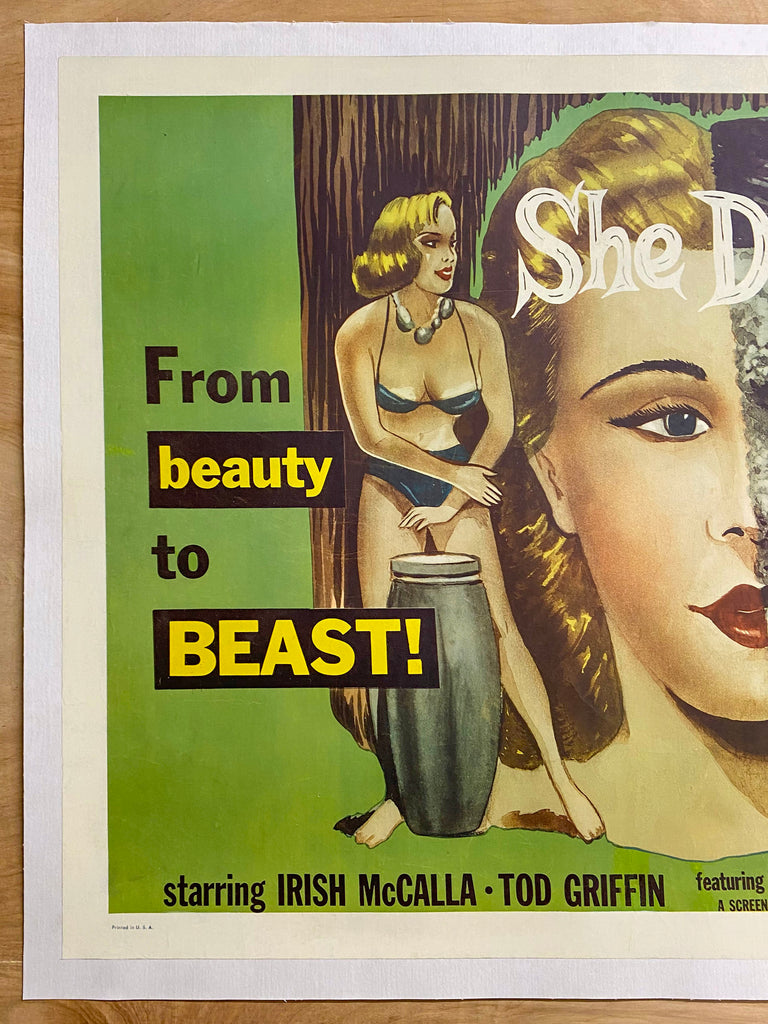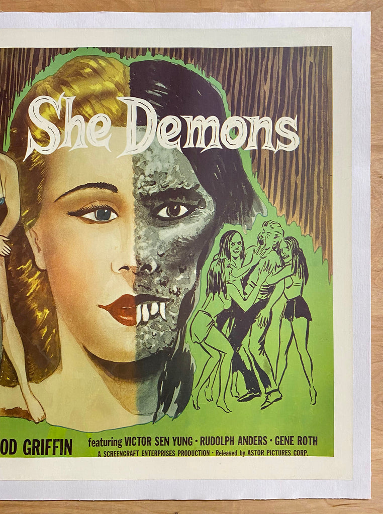 This is a vintage original half sheet poster for the 1958 first American release of the black-and-white science fiction horror film She Demons. This film was produced by Arthur A. Jacobs and Marc Frederic, directed and co-written by Richard E. Cunha and starred Irish McCalla, Tod Griffin, and Victor Sen Yung (who is most remembered today for this roll as Hop Sing on the television series Bonanza).