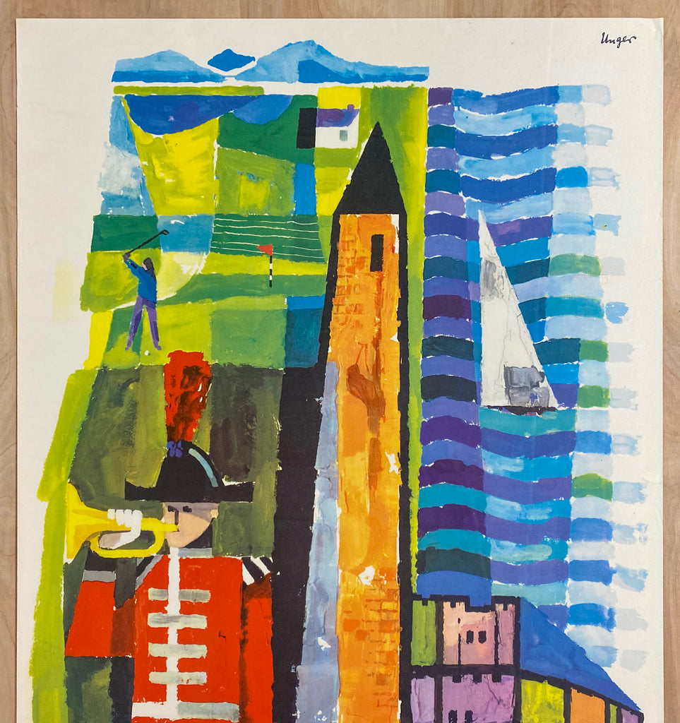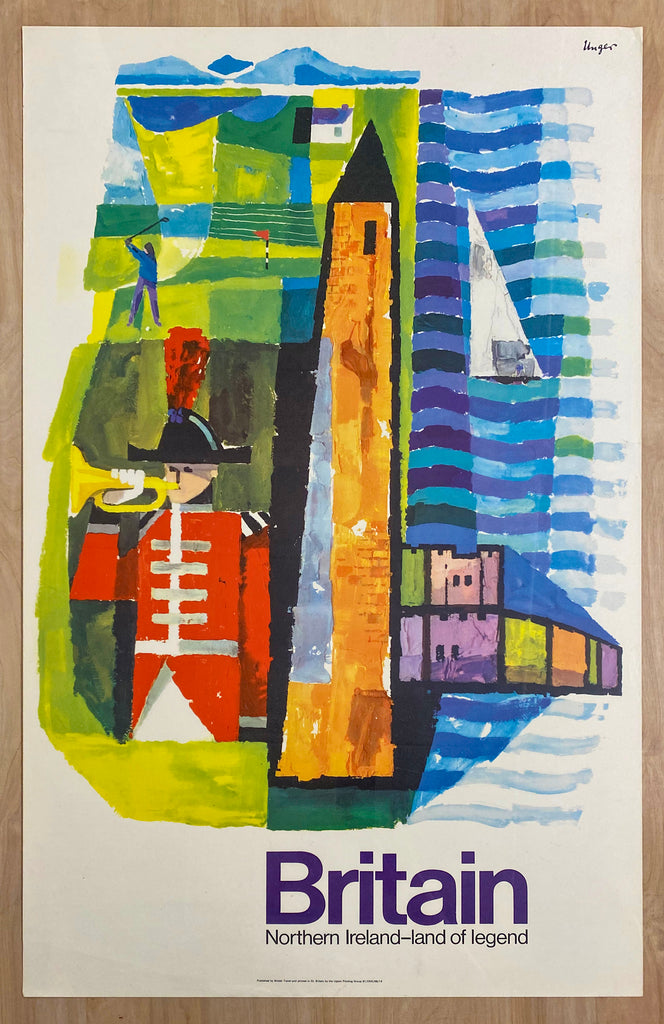 This vintage original British travel poster promoting Northern Ireland as a travel destination was created by Hans Unger and issued by the British Travel Association in 1968. Unger’s colorful style features a man playing golf, a sailboat, Antrim Tower and the bugler of the Hillsborough Fort Guard over the title Britain Northern Ireland – land of legend. Hans Unger was born in Germany and emigrated to South Africa in 1936 and then to Great Britain in 1948 after serving in WWII. Unger designed several posters for London Transport and other British clients and is among the most prolific and recognized poster artists working in Great Britain in the postwar era. Text below the title indicates this poster was printed in Great Britain by the Upton Printing Group and shows the document code 91/ENG/68/14 indicating a 1968 publication date.