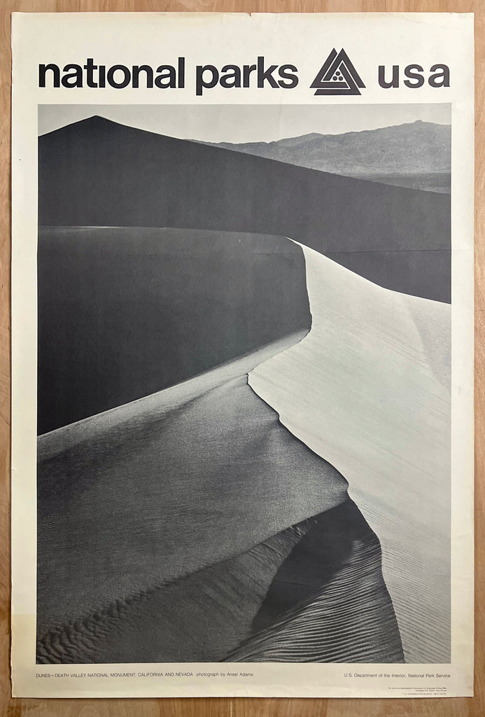 This vintage original poster is one in the National Parks USA series of posters featuring the photography of Ansel Adams issued by the United States Department of the Interior’s National Park Service in 1968. This poster features Adams’s photography of the unforgiving and starkly beautiful landscape of Death Valley of California. The lower margin is titled: DUNES – DEATH VALLEY NATIONAL MONUMENT, CALIFORNIA AND NEVADA photograph by Ansel Adams. The lower left corner is printed with the date 1968.