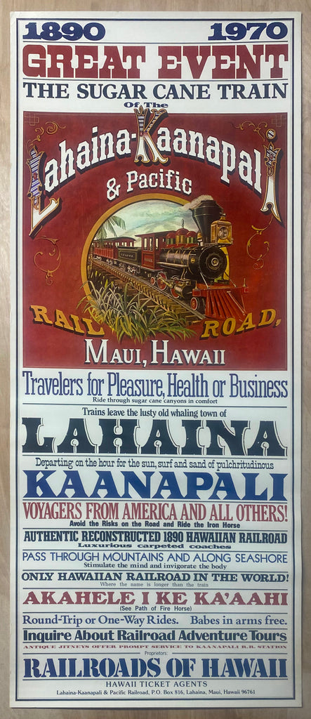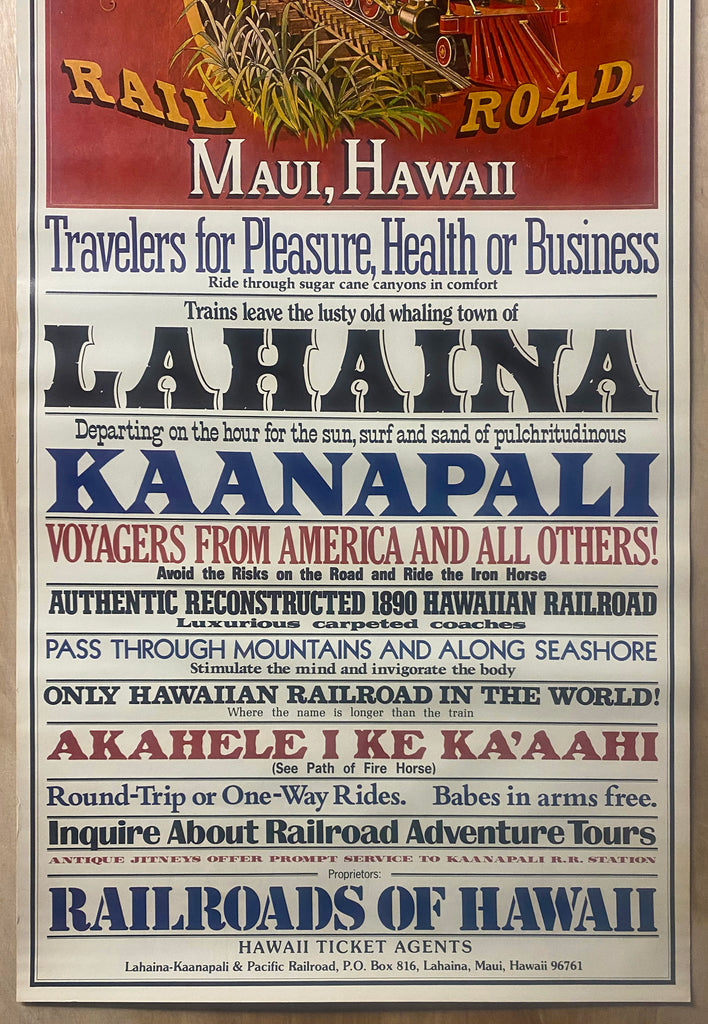 This is a vintage original poster from the 1970 opening of Sugar Kane Train of the Lahaina, Kaanapali & Pacific Railroad which was a steam-powered, narrow gauge heritage railroad and tourist attraction on the Hawaiian island of Maui. The LKPRR paid homage to Hawaii’s railroad history and operated the 6-mile 40-minute Sugar Kane Train along an old line that had connected the sugarcane fields of Ka’anapali to the Pioneer Mill in Lahaina. The Sugar Kane Train operated as a tourist attraction from 1970 to 2014 and was severely damaged probably beyond recovery by the August 2023 Lahaina wildfire.