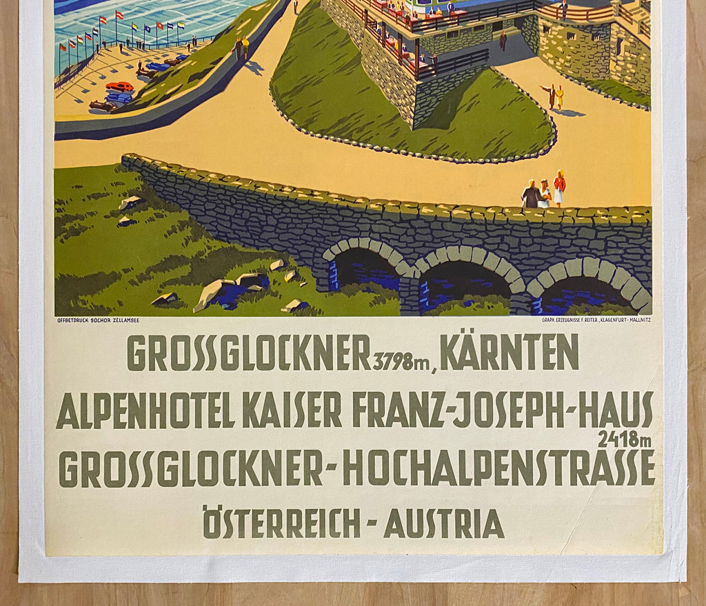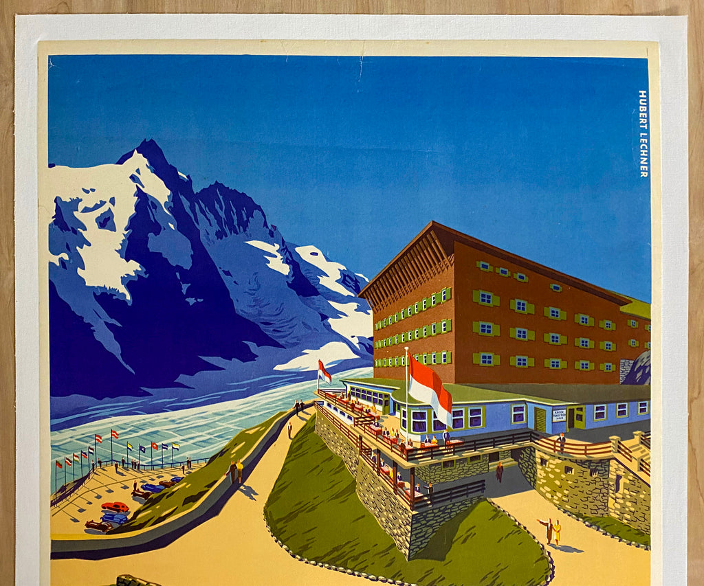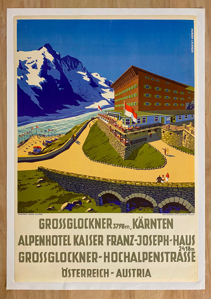 This vintage original c.1950 Austrian travel poster was created by the artist Hubert Lecnher (1903-1990). For this poster Lechner renders a colorful summer day image of the Alpenhotel Kaiser Franz Joseph Haus, the Grossglockner Hochalpenstrasse (Alpine High Road) and Grossglockner, Austria’s highest mountain. Lechner’s name appears in print in the upper right corner of the image and just below the image the printer is identified as Offsetdruck Sochor Zellamsee. Also printed just below the image is Erzeugnisse F. Reiter, Klagenfurt-Mallnitz.