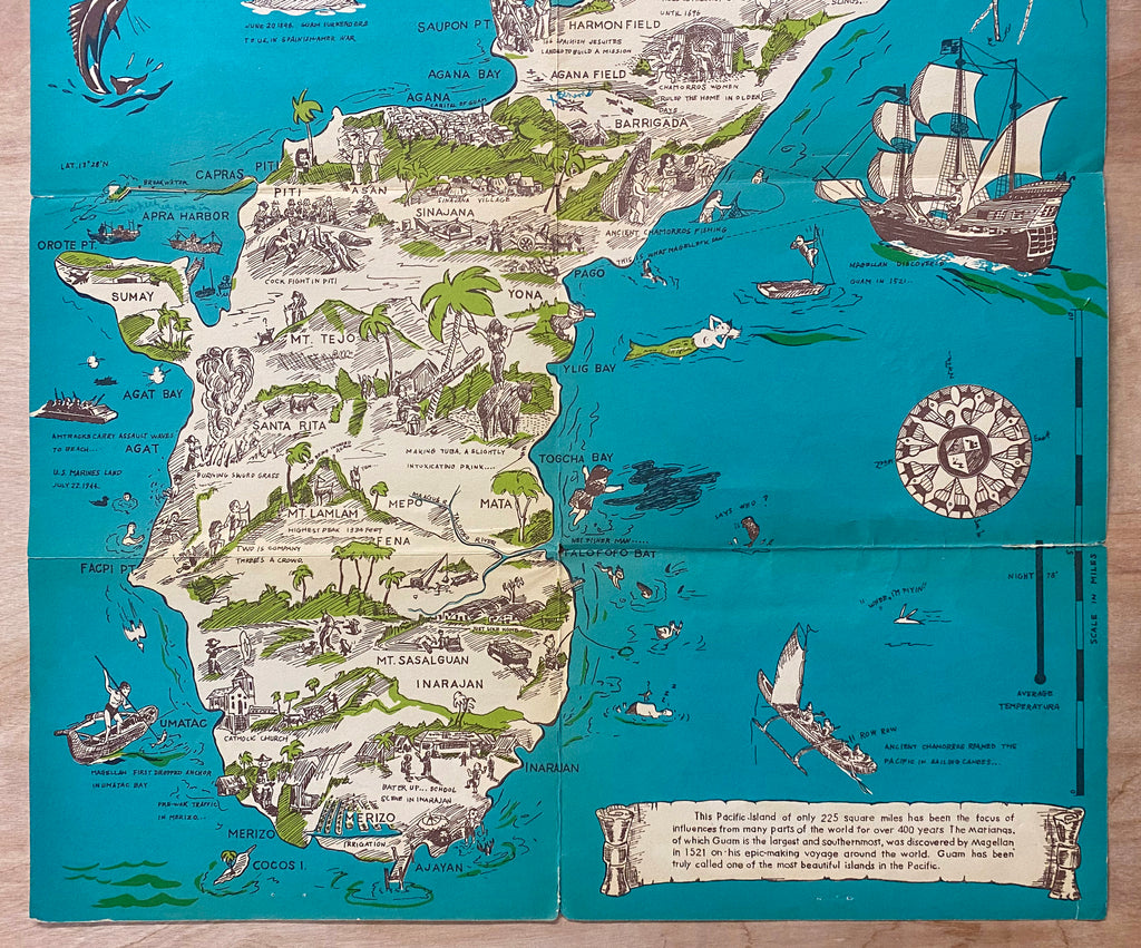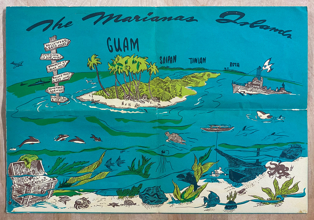 This delightful pictorial map of Guam and the Marianas Islands is a vintage original issued a few years after the end of WWII. This map is folded and was designed as mailer that could be sent home by American military and others visiting Guam in the late 1940s and 1950s.
