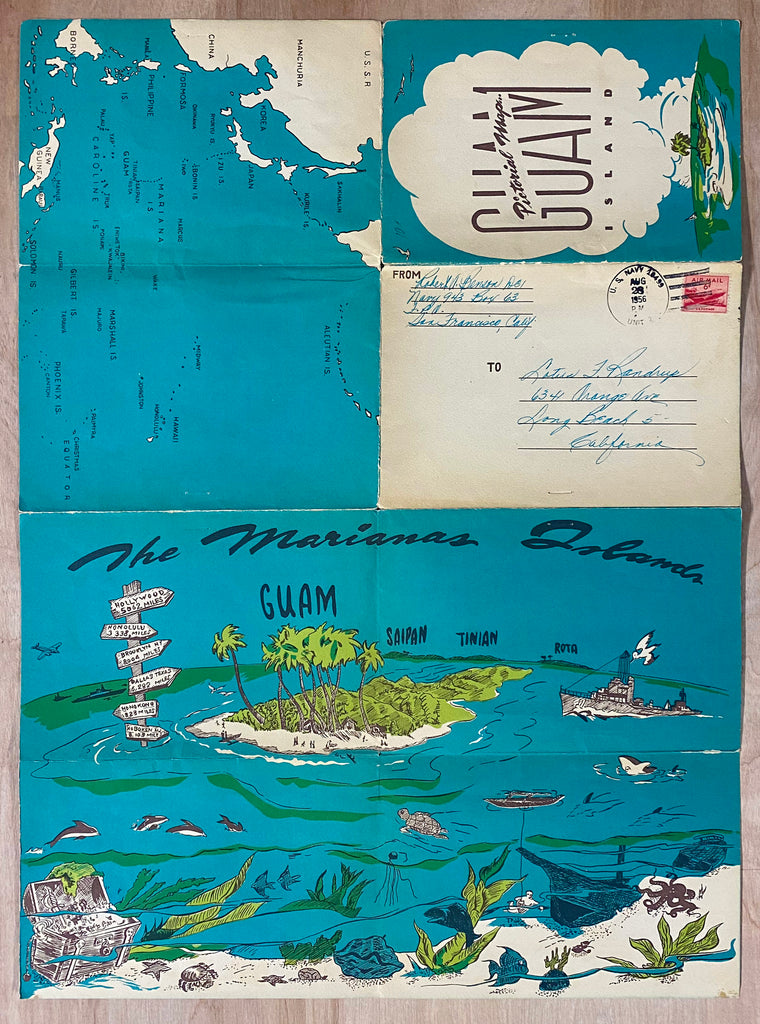 The entirety of one side features a charming pictorial map of Guam titled The Historical Island of Guam of the Marianis Islands. The other side features a pictorial map of the Marianas Islands including Guam, Saipan, Tinian and Rota along with a map of the Pacific region and the cover panels. This map isn’t dated but the pictorial map of Guam makes reference to the WWII Japanese occupation of Guam ending August 10, 1944. The map also shows the “Pacific Clipper” flying boat airliner which was operated by Pan American Airlines initially and was out of service by 1951. This pictorial map was mailed home and has a United States Navy postmark dated August 1956 but was likely printed closer to 1949 or 1950.
