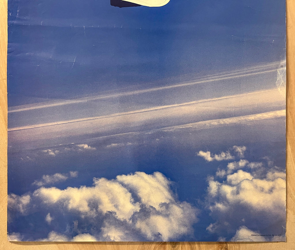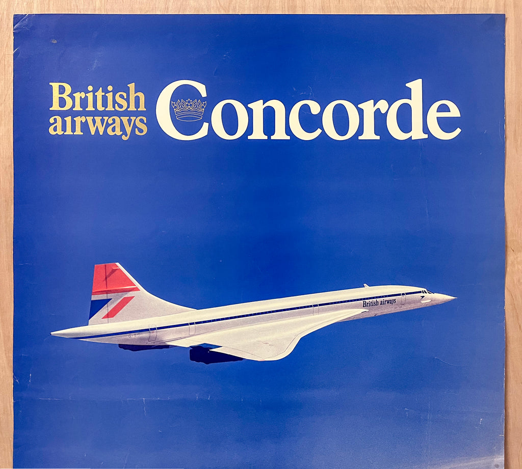 This is a vintage original poster issued by British Airways in the mid to late 1970s to promote the airline’s flagship Concorde transatlantic service. This poster features a view of the Concorde in flight with text that reads simply: