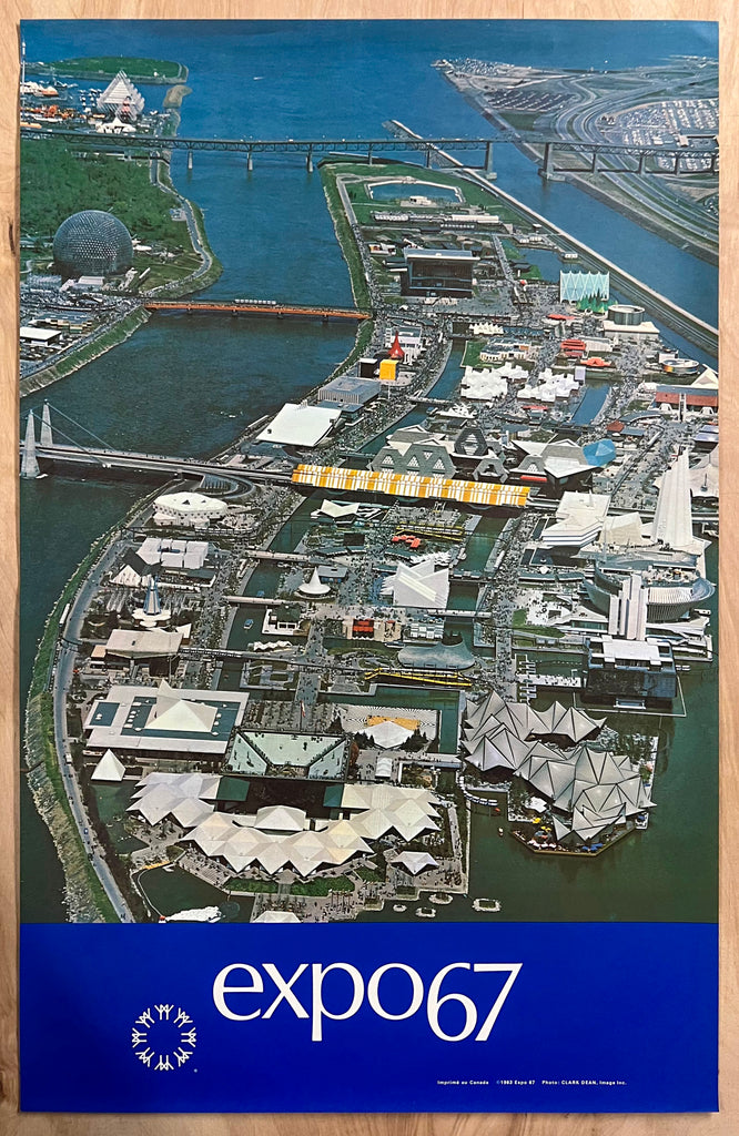 This group of four posters includes posters featuring a bird’s-eye View of the Expo 67 fairgrounds, the USA Pavilion geodesic dome designed by Buckminster Fuller, the USSR pavilion and the Katimavik inverted pyramid Canadian pavilion. All posters have a 1963 copyright indicating they were issued a few years before the opening of the fair in 1967. A photography credit to Chicago photographer Clark Dean is also printed in the lower right corner on all posters.