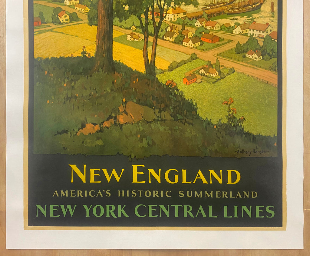 This gorgeous vintage original Depression Era poster in one of several issued by the New York Central Lines to promote travel to destinations served by the railroad. For this poster, the artist Anthony Hansen renders an image a quaint seaside New England village replete with a lighthouse, fishing boats and tidy cottage homes. Text at the bottom of the poster touts New England as “America’s Historic Summerland”. The artist’s name is signed in print in the lower right corner of the image and the lower margin indicates this poster was printed by the Latham Litho. & Ptg. Co., Long Island City, New York.