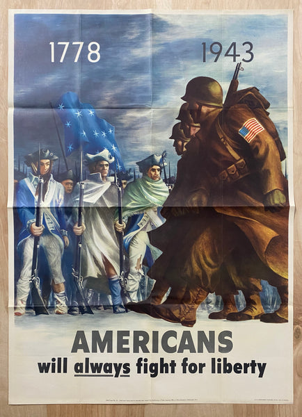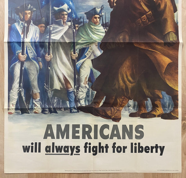 This stirring poster was created by the artist Bernard Perlin during the darkest days of WWII for the Office of War Information as OWI Poster No. 26. Under a wintry gray sky, American G.I.s in their burly US Army wool trench coats march purposely past a wall of Revolutionary War Minutemen who stand at stern attention with the hardship of Valley Forge winters etched on their faces. The scene of Revolutionary War soldiers and soldiers from WWII together in the same image underscores the time tested truth of the poster's simple tag line - Americans will always fight for liberty. This is the large full size "one sheet" format for this poster.