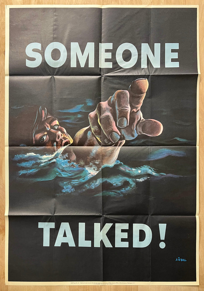 This powerful and dramatic poster by the artist Frederick Siebel was issued in 1942 shortly after the United States entered WWII. The stark image features a sailor struggling to keep his head above water pointing directly at the viewer with the simple admonition “Someone Talked!” Simple and effective, the poster reminds that loose lips sink ships.