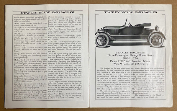 This catalog features the Stanley Steam Car models 725 Touring Car, 726 Roadster, 727 Delivery Wagon, 825 Mountain Wagon and 825 Express Wagon. This unpaginated catalog is fully complete but the centerfold pages 7 to 14 detached at the staple binding and are laid neatly back in without damage.