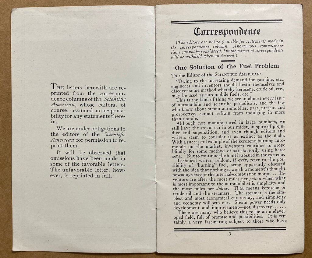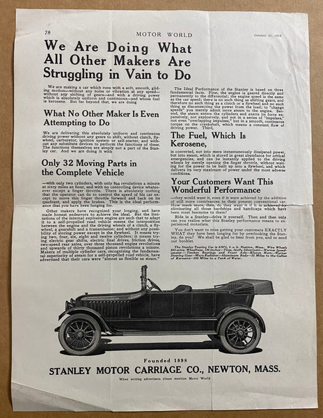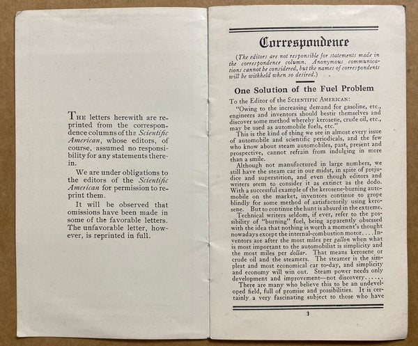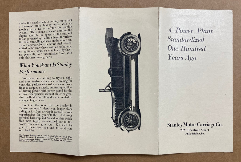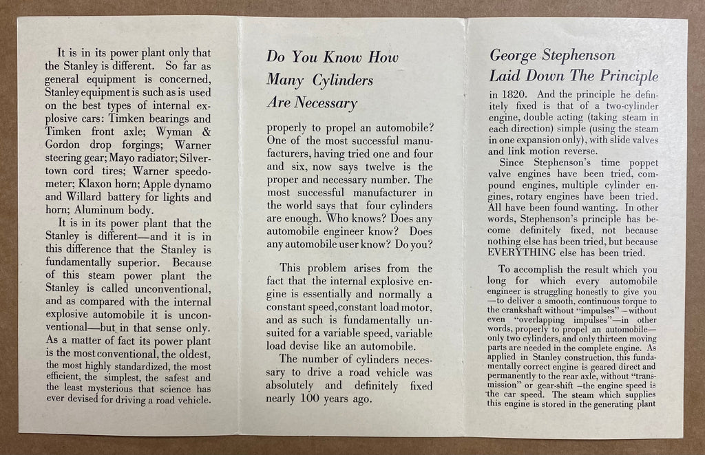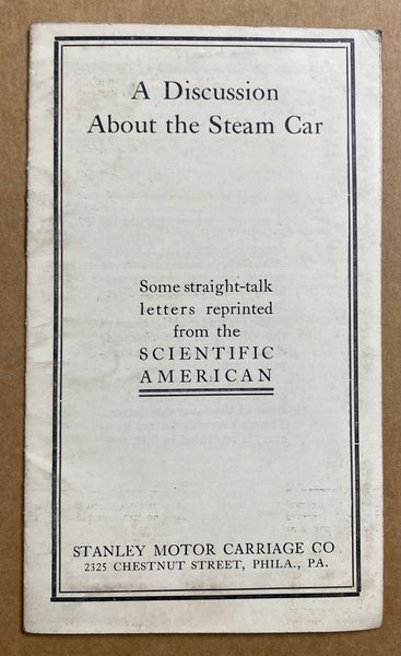 Also included is a small undated c.1916 foldout brochure titled A Power Plant Standardized One Hundred Years Ago, a c.1916 booklet titled A Discussion About the Steam Car – Some straight-talk letters reprinted from the Scientific American and a full page offprint of a Stanley Motor Carriage Co, advertisement that appeared in the October 25, 1916 issue of Motor World magazine.