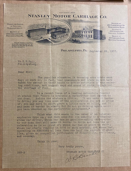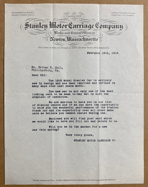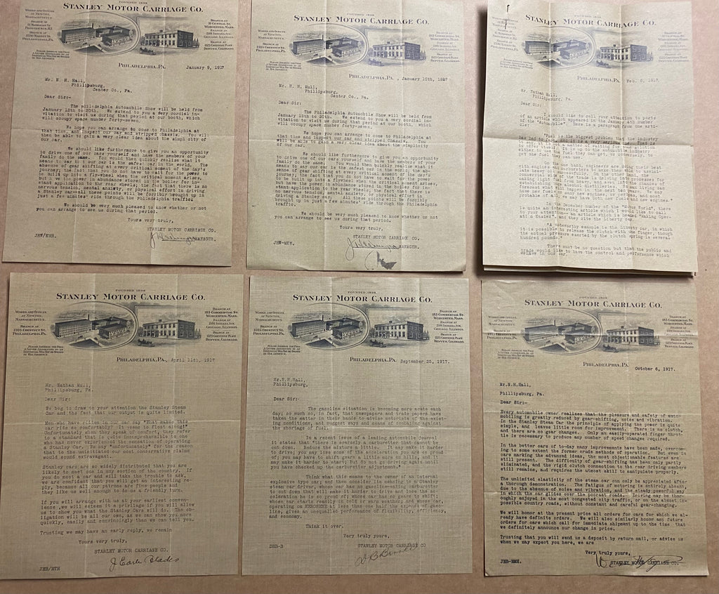 Also included with these pieces of Stanley sales literature are seven typed letters including six letters on the letterhead of the Stanley Motor Carriage Company’s Philadelphia office dated between January 9 and October 17, 1917 and one letter on the letterhead of the Stanley Motor Carriage Company Works and General Offices of Newton, Massachusetts dated February 16, 1918. These letters are sent to a prospective buyer and have good content generally touting the features and advantages of Stanley Steam Cars. One letter is two pages and the others are all a single page. All letters are fully complete and in excellent condition and are the letters only without envelopes. The letters from the Stanley Motor Carriage Company’s Philadelphia office are all signed including three signed by Manager J.A. Wright. The 1918 letter sent from the Newton office is an unsigned form letter announcing the arrival of the 1918 Stanley models.
