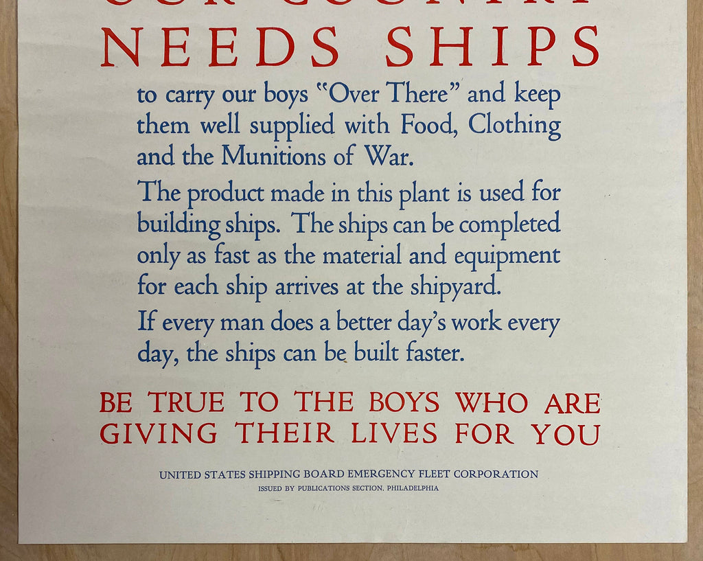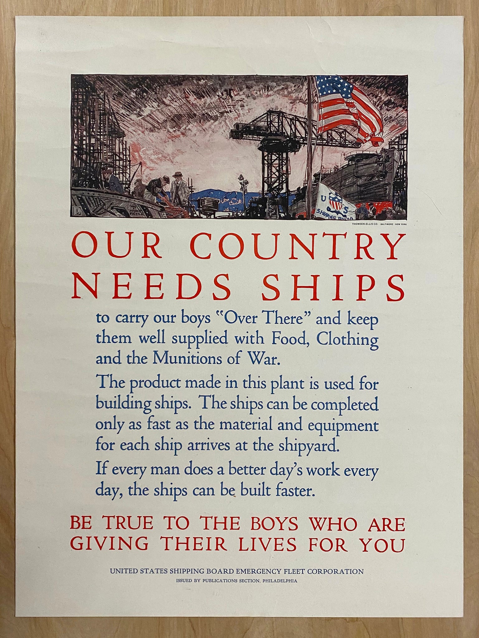 For this poster Meyer renders an image of an American flag flying over a busy shipyard with a block capital headline proclaiming OUR COUNTRY NEEDS SHIPS. Additional text on the poster appeals to the wartime factory workers who were building the component parts for American ships supplying the war fighters in Europe. The poster asks these home front workers to “Be True To The Boys Who Are Giving Their Lives For You” and do “…a better day’s work every day”. The Emergency Fleet Corporation was established by the United States Shipping Board in April 1917 to acquire, maintain, and operate merchant ships in the interest of national defense during World War I.