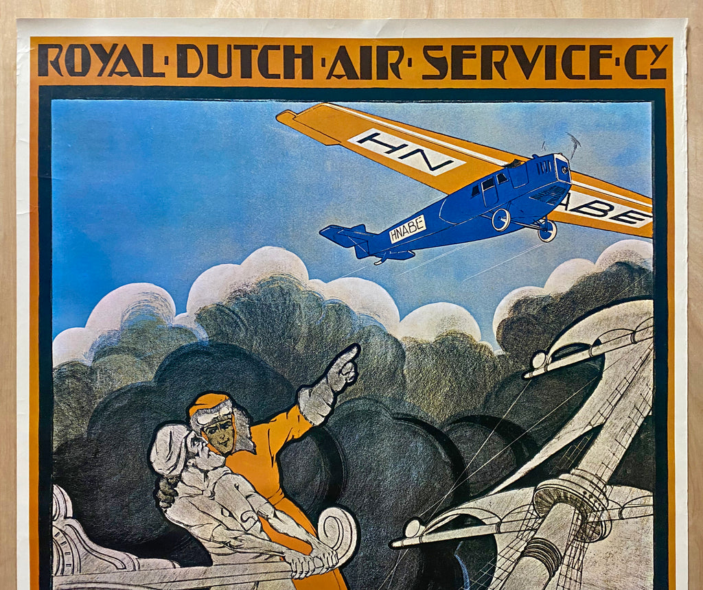 KLM Royal Dutch Airlines, the national flag carrier of The Netherlands, reissued several early posters on the occasion of that airline’s 50th anniversary in 1969. This poster, designed by Dutch artist Antonius Mathieu Guthschmidt and originally issued in 1924, is one such example of these 1969 50th anniversary reissues. This poster features what was then a modern KLM aircraft flying over ghost ship of legend The Flying Dutchman. The poster was intended for a British audience and features English language text which reads: