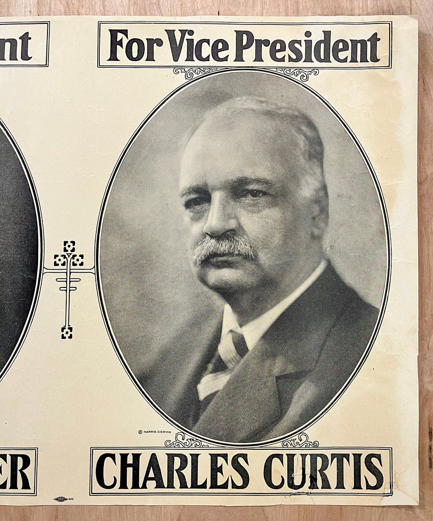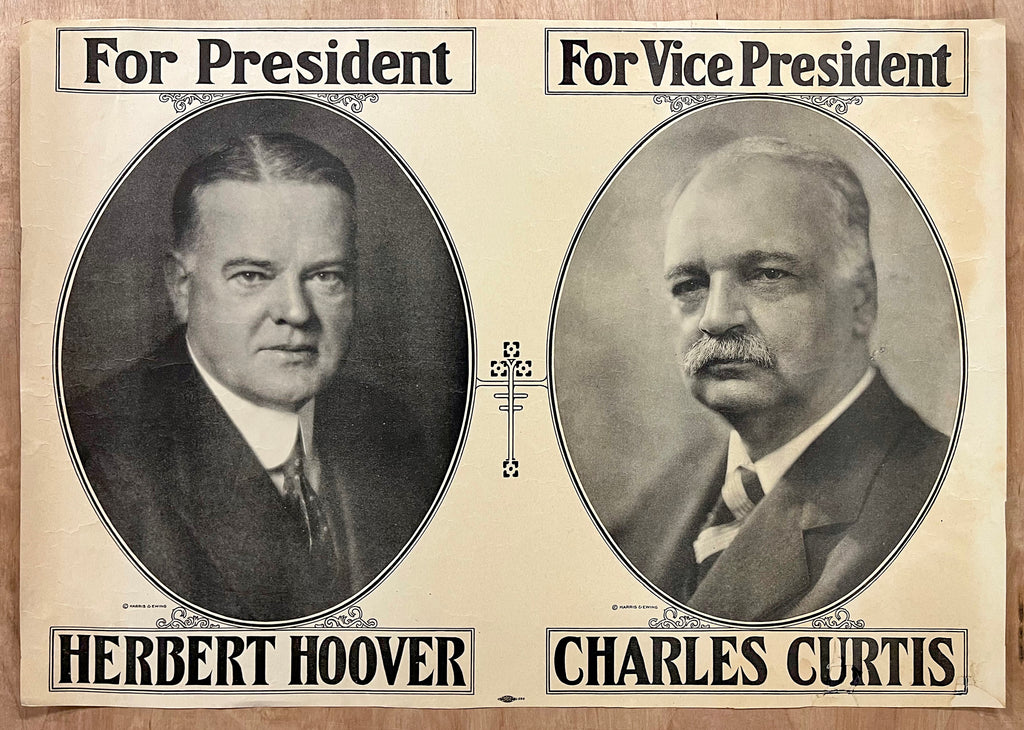 This is a vintage original poster from Herbert Hoover’s successful 1928 presidential campaign. This horizontal format poster features jugate photographic portraits of Hoover and his vice presidential running mate Charles Curtis who was enrolled as a member of the Kaw Nation of Kansas and the first native American to serve in the United States Congress and the only native American so far to serve as Vice President. The portraits of both candidates have copyrights by the venerable Washington D.C. photography studio of Harris & Ewing. An Allied Printing Trades union emblem is printed at the bottom center of the poster.