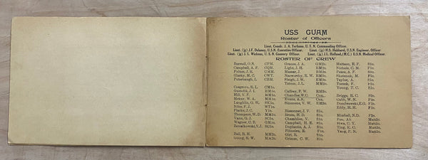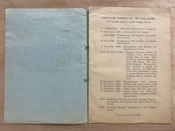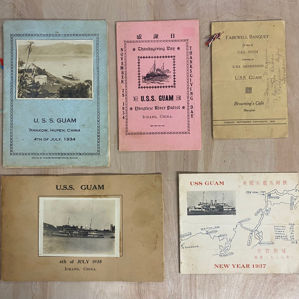 This is a lot of five vintage original menus dating between 1932 and 1937 from the United States Navy Yangtze River Patrol Gunboat USS Guam P-3 while on service in China which include a few photos, rosters of the ship's crew and officers, an intinerary and brief histories of the ship.