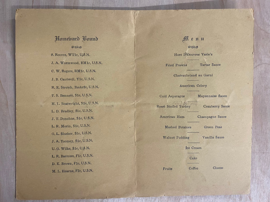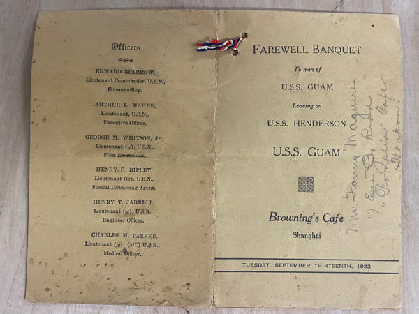 #1.) Farewell Banquet To men of the U.S.S. Guam Leaving on U.S.S. Henderson – Browning’s Café Shanghai Tuesday, September 13, 1932. This menu is a four page pamphlet measuring about 6.5” x 4” and includes a list of 16 enlisted men and their ranks that were “Homeward Bound”. Also included is a list of the ship’s officers printed on the back cover page.