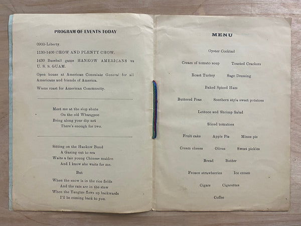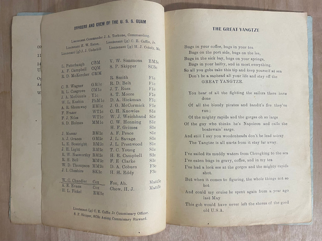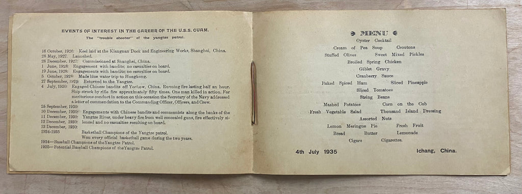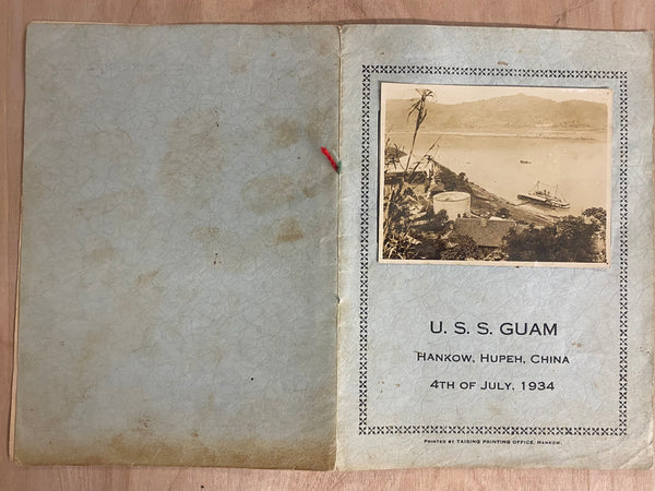 #2.) USS Guam 4th of July, 1934 Hankow, Hupeh, China. This menu is 10 pages including the covers measuring about 8.25” x 5.75” with a photo of the ship in China tipped onto the front cover. This menu includes a brief history of the ship under the title Events Of Interest Of The U.S.S. Guam The “trouble shooter” of the Yangtze Patrol noting various engagements with Chinese bandits and communists. Also included in this menu is the Program of Events for the day, a list of the ship’s officers and crew and a coarse poem titled The Great Yangtze.