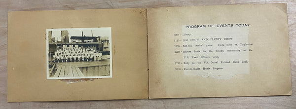 #4.) 4th of July 1935 Ichang, China. This menu is an oblong format of eight pages including the covers measuring about 9” x 5.75” and includes a photo of the ship tipped on to the front cover and a photo of the crew tipped onto the inside front cover. Also included is a program of events for the day and a brief history of the ship under the title Events Of Interest In The Career Of The U.S.S. Guam - The “trouble shooter” of the Yangtze Patrol noting various engagements with Chinese bandits and communists. Also included is a list of the ship’s officers and crew printed on the inside back cover.