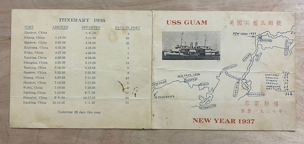 #5.) New Year 1937 USS Guam Nanking. This menu is an oblong booklet format of four pages measuring about 6.5” x 5.5” with a photo of the ship printed on the front cover along with a map of the Yangtze River showing different cities visited by the USS Guam in 1936. The inside front cover prints a list of the officers and crew of the ship and the back cover prints the ship’s itinerary for 1936 noting port, arrival and departure dates and how many days in port for each listing.