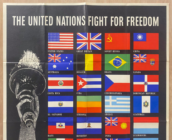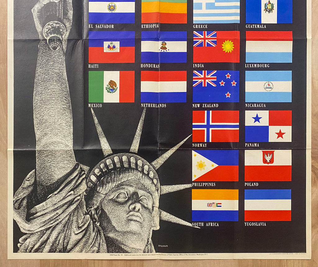 This vintage original WWII poster was created by Canadian born artist Steve Broder and issued by the Office of War Information as OWI Poster No. 19 in 1942. The poster features a ground level perspective view of the Statue of Liberty lifting her lantern high next to the flags of the United States and her allies under the simple headline The United Nations Fight For Freedom.