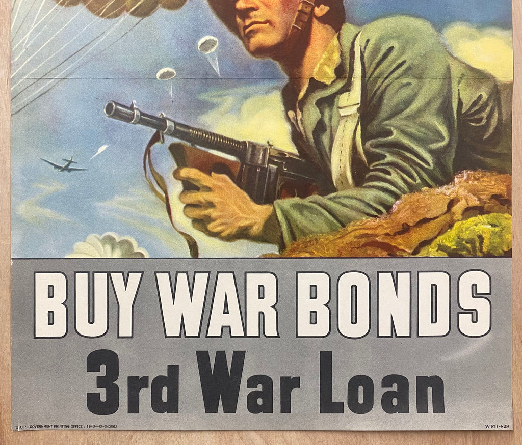 This vintage original WWII poster was created by Belgian-American artist Georges Schreiber and issued to support the Third War Loan Drive that ran in September and October, 1943. This poster features a dramatic image of resolute US Army paratrooper gripping a Thompson submachinegun as the skies above him fill with airborne forces. The ground level perspective of the image adds emphasis to the poster’s tagline to BACK THE ATTACK! and BUY WAR BONDS.