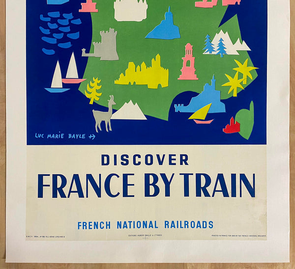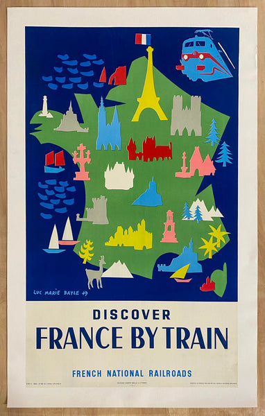This vintage original travel poster was designed by French naval officer and artist Luc-Marie Bayle and issued by the French National Railways in 1954.  This poster features a stylized pictorial map design locating various French regional landmarks and points of interest set against an outline of the country.  This poster was issued in a couple different variations and this is the English language edition with a title across the bottom that reads DISCOVER FRANCE BY TRAIN.   Luc-Marie Bayle’s name is signed in print in the lower left corner of the image area.  The lower margin indicates this poster was printed in France by the French National Railways in 1954 and identifies the printer as Hubert Baille & Cie – Paris.