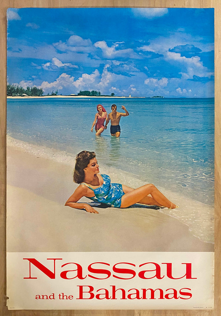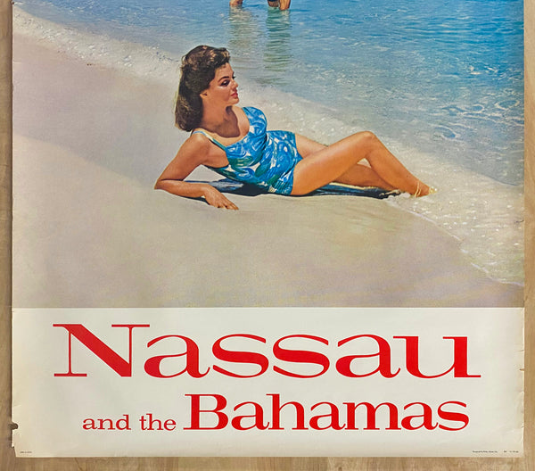 This vintage original Atomic Age travel poster promotes Nassau and the Bahamas as a travel destination. Friendly Atomic Age beachgoers wade ashore from a crystal clear sea as a statuesque beauty reclines in the surf forming a Kennedyesque Camelot era idealized seaside paradise vacation scene.  While not technically in the Caribbean Sea, The Bahamas is a full member of CARICOM (Caribbean Community) and considered part of the wider Caribbean region.  The lower margin indicates this poster was designed by the Kelly, Nason, Inc. advertising agency and shows a date of 11/10/63.