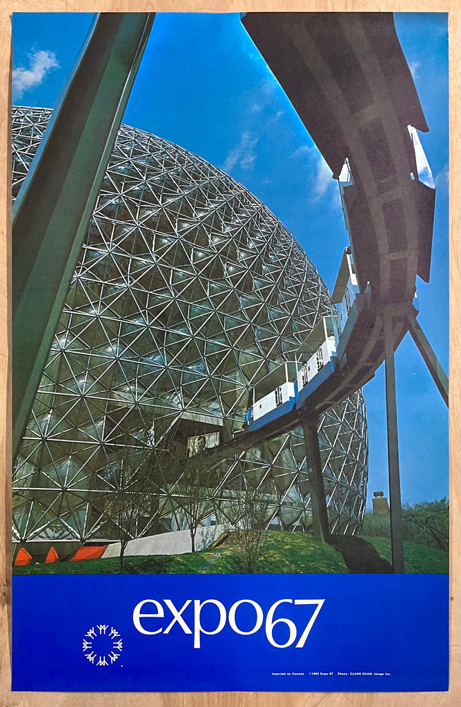 This vintage original poster is one in series used to promote the 1967 International and Universal Exposition or Expo 67 as it was more commonly known.  This world’s fair ran from April 28 to October 29, 1967 in Montreal, Quebec, Canada and is considered to be one of the most successful world's fairs of the 20th century.   This poster features a view of the geodesic dome USA Pavillion designed by Buckminster Fuller which was one of the most visited sites of Expo 67.  The lower right edge has a 1963 copyright indicating the poster was issued a few years before the opening of the fair in 1967.   A photography credit to Chicago photographer Clark Dean is also printed in the lower right corner.
