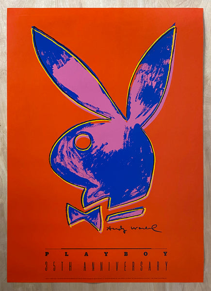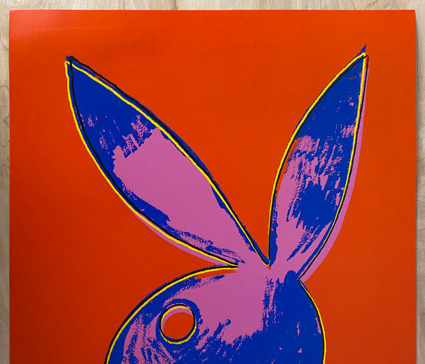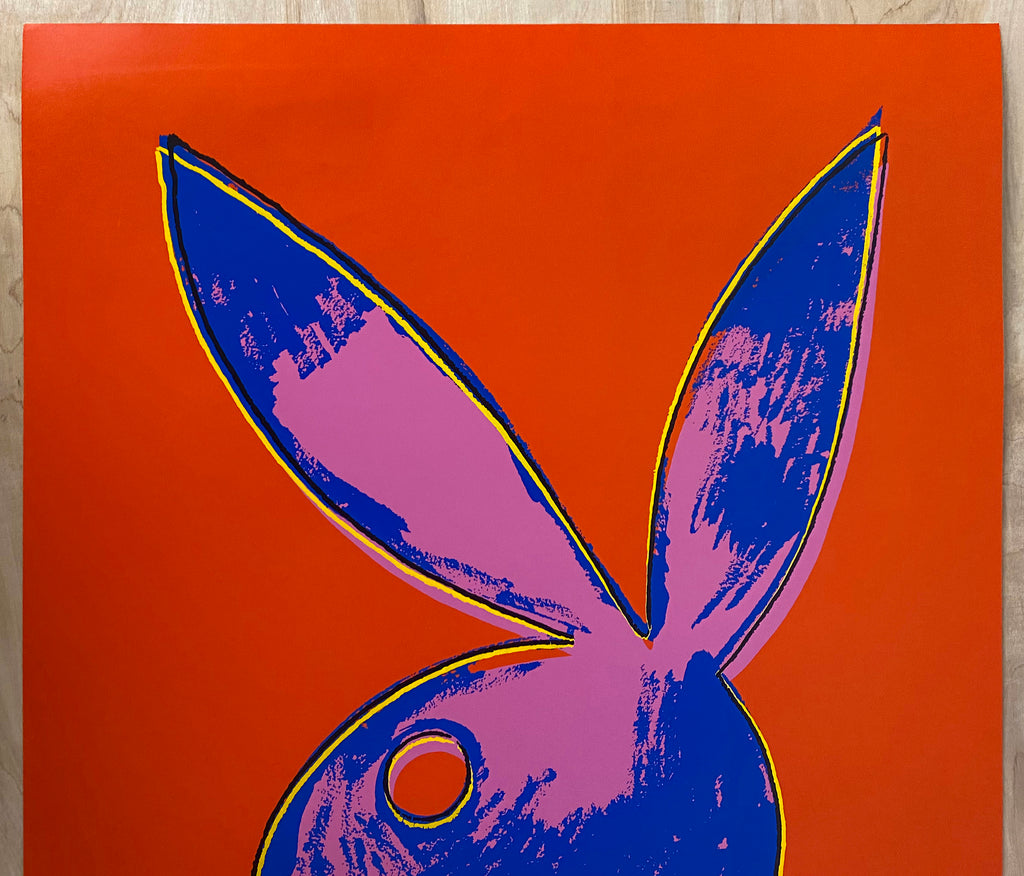 Warhol’s signature appears in print just below his Pop Art stylized rendering of the familiar Playboy mascot of a silhouetted bunny head wearing a bow tie. This is a screenrprint poster on heavy paper. This poster is a vintage original from magazine’s limited edition offering printed in the 1980s and looks pretty well unused with only light handling and couple minor marks on the back not affecting the front side. Overall condition is excellent.