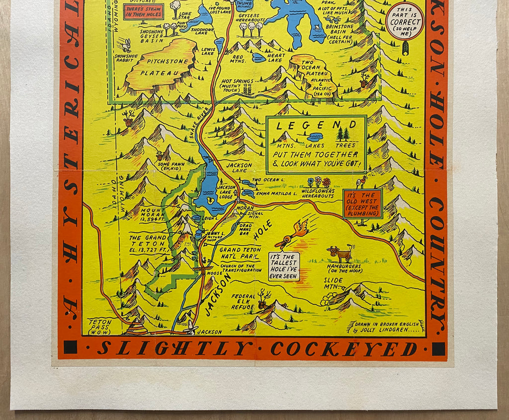 c.1950 Hysterical Map of Yellowstone National Park Jackson Hole Jolly Lindgren