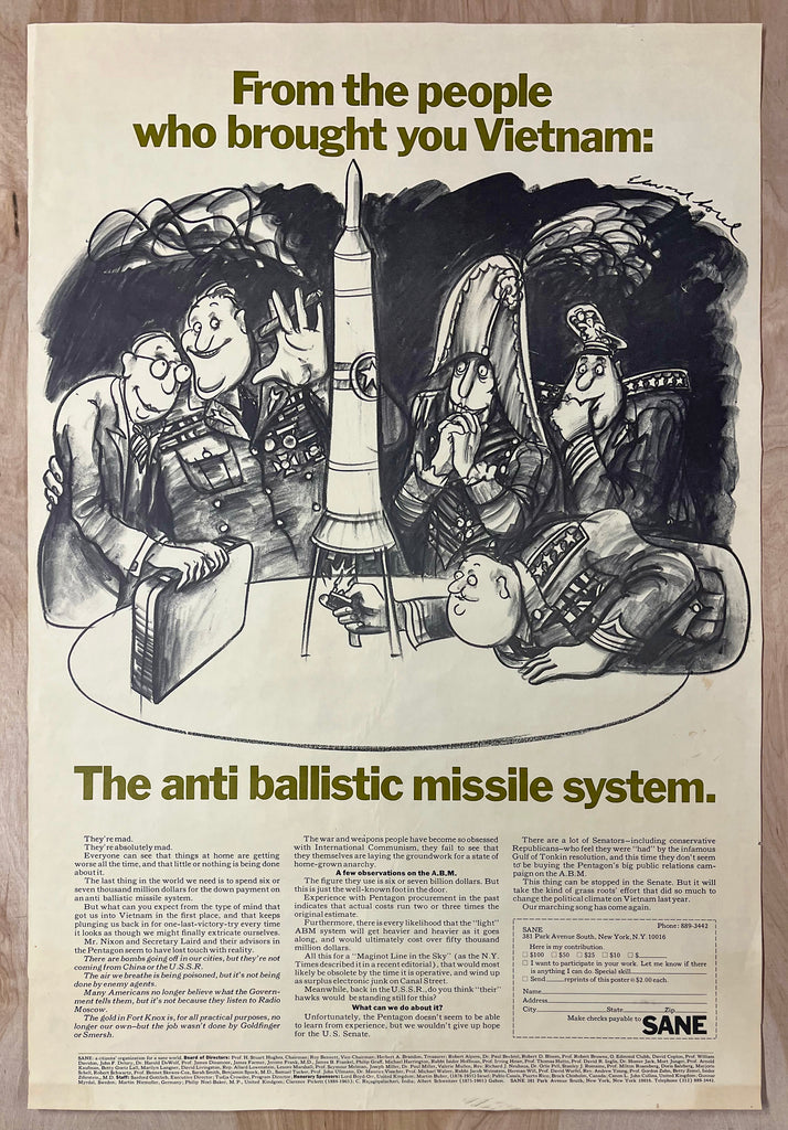 This vintage original c.1969 poster was created by Edward Sorel for SANE, a nonprofit organization founded in 1957 to advocate against the development and deployment of nuclear weapons and to promote common security and peaceful resolution to international conflicts. For this poster Sorel renders a political cartoon style image which could have been inspired by the 1964 political comedy black satire film Dr. Strangelove bracketed by the title: From the people who brought you Vietnam: The anti ballistic missile system. Text below criticizes the Anti-Ballistic Missile (ABM) System being developed by the Nixon Administration as a “Maginot Line in the Sky” as described by the New York Times editorial page. Additional text at the bottom lists the Board of Directors and Honorary Sponsors of SANE.
